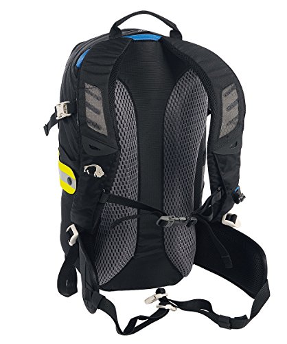 [1] Vent Comfort-Tragesystem [2] Trinkschlauch-Fixierung am Schultergurt [3] Höhenverstellbarer Brustgurt mit Signalpfeife [4] Verstaubarer Hüftgurt [5] Hüftgurt mit Reißverschlusstaschen [6] Seitliche Kompressionsriemen [7] Handgriff