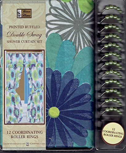 Double Swag Fabric Shower Curtain /12 Coordinated Rolling Ring Hooks, 2 Tie Backs (Sun Flower ~ White)