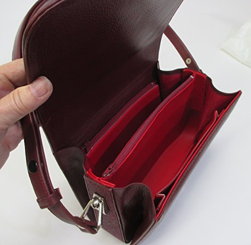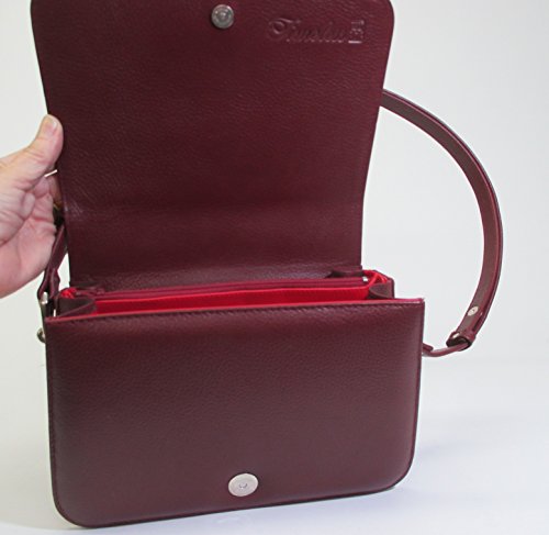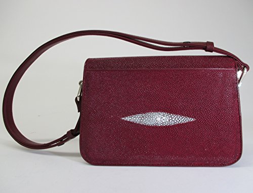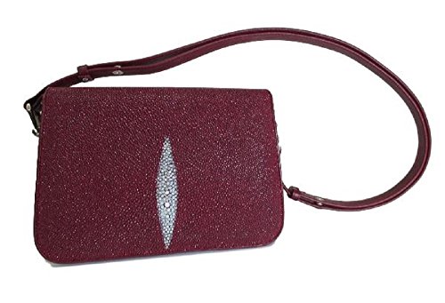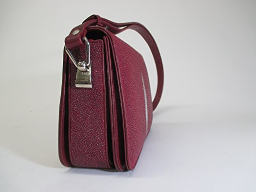 - Elegant stingray skin leather adjustable shoulder bag with front pearl motif, burgundy. Outside is made of genuine stingray skin with leather trim, bottom, and lining. MODEL 10412
