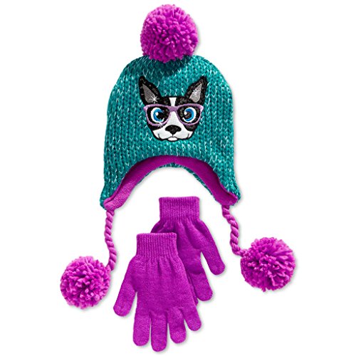 Binding : Apparel Product Description Keep her warm with this cozy girls' hat and glove set from Berkshire Fashions. The fleece lined Peruvian style hat features a chunky stretch knit, sequin embellished dog, fuzzy pom and braided tassels. Coordinating stretch gloves with ribbed cuffs complete the look. Hat: Shell 100% Acrylic, Lining 100% Polyester; Gloves: 97% Acrylic / 3% Spandex. One Size fits most girls size 7-14. 0