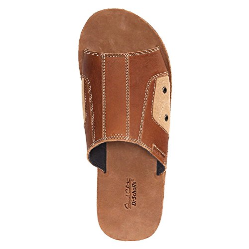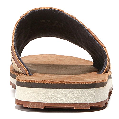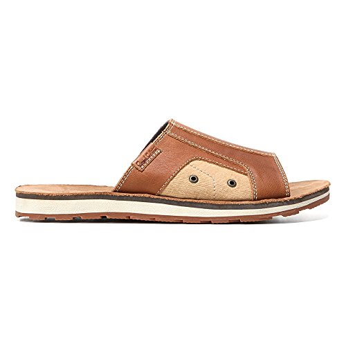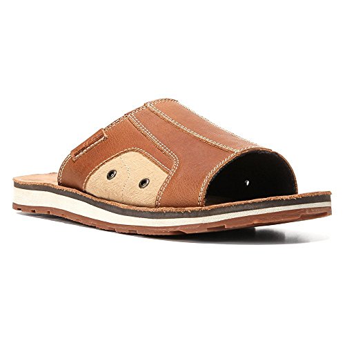 Slide sandal with full-grain leather upper featuring canvas side panels and grommet hardware