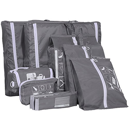 8 different sizes travel packing bag to accommodate your different types of clothing, like pajamas, underwear, socks, jewelry, etc.. Save space for more necessities you need.