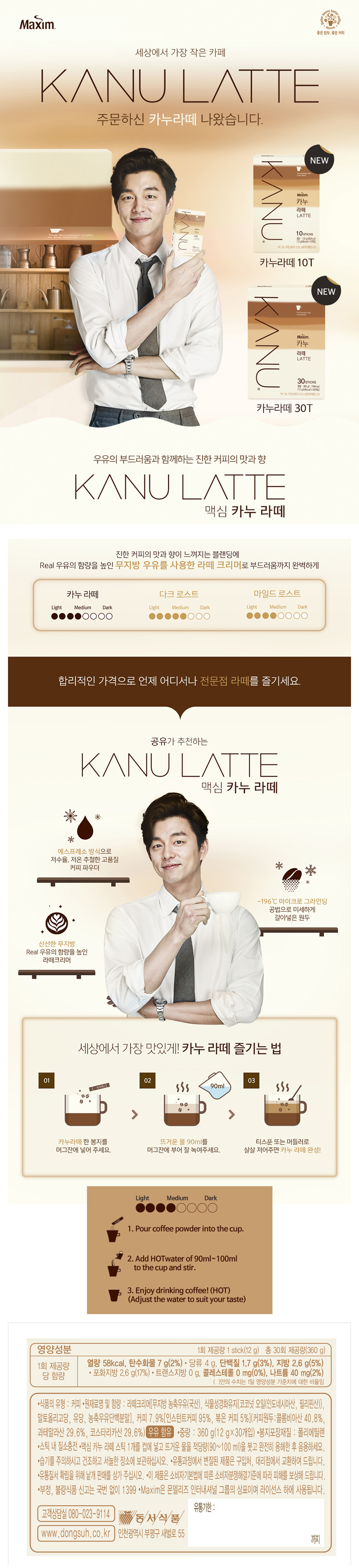 that you can not feel in the conventional coffee. (Compared to existing products)1A grade non-fat milk ~The best espressoUsing a fresh 1A grade nonfat milk creamer,We offer a deeper and richer espresso latte than specialty store latte.* Maximal flavor (-196 degrees micro grind)* Optimal roasting point (OPR method)* Aroma keeping (SARP method)How to enjoy deliciousEnjoy a deep and rich latte with 1 stick and 100-120ml water ~ ~