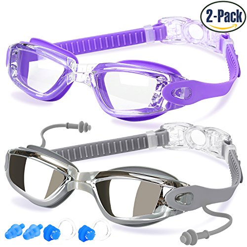 PRODUCTS & SERVICE: The goggles' frames have relatively larger sizes, which are NOT recommended to kids under 8 years old. Each package includes: Swim Goggles with Different Lenses x 2, Nose Clips x 2 and Ear Plugs x 1 pair. 12-Month Guarantee: If there is anything wrong with our products, please contact us via E-mail without hesitation. Our customer services are reliable and we will solve the problem for you as soon as possible