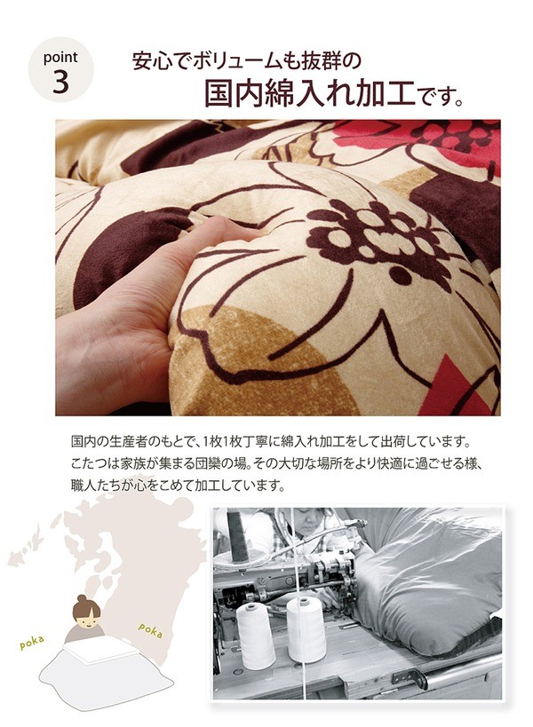 カジュアルなデザインのこたつ布団です。表地には柔らかな肌触りの短毛のマイクロファイバー生地を使用しています。部分暖房のこたつは電気代もお得です。