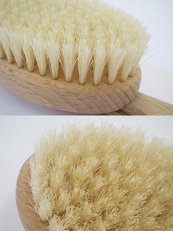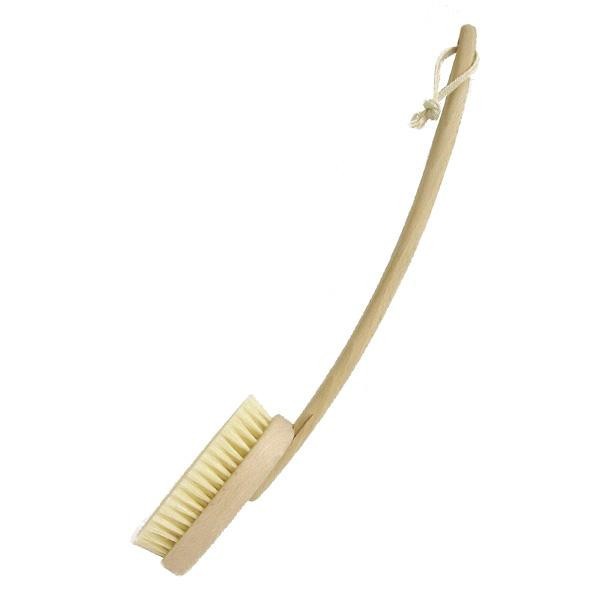 背中にブラシがフィットしやすい柄のカーブと、ラクに持てるグリップが特徴!柄は天然木、ブラシは豚毛を使用した日本製のボディブラシです。