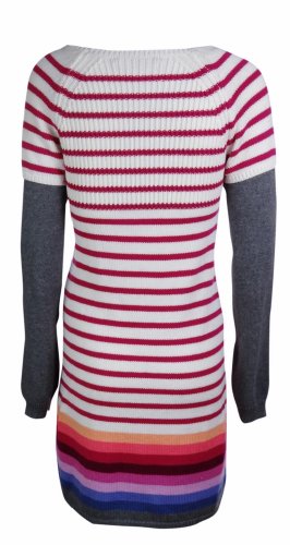 This contemporary sweater dress by Nine West features no lining, pull over, faux layered long sleeves, rib knit, crew neck, varying stripe pattern, knee length, button detailing, and front patch hip pockets.