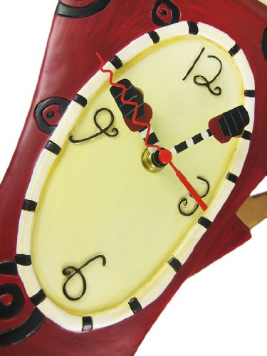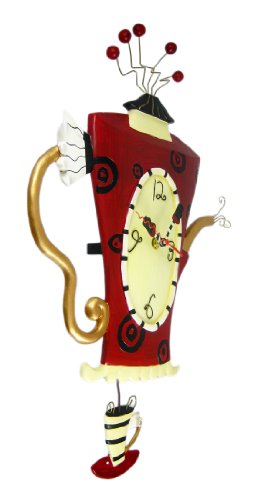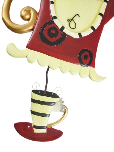 This whimsical teapot pendulum clock is called Steamin Tea and is by Allen Designs. Made of cast resin, this clock features a black, red, cream, metallic cold and white enamel finish, and has a cup and saucer swinging back and forth at the bottom of the pendulum. The clock is hand-painted and coated in polyurethane to keep the colors bright and give it a glossy look. It measures 20 inches high, including the pendulum, and is 13 1/2 inches wide. It is a must-have for tea lovers.Feature