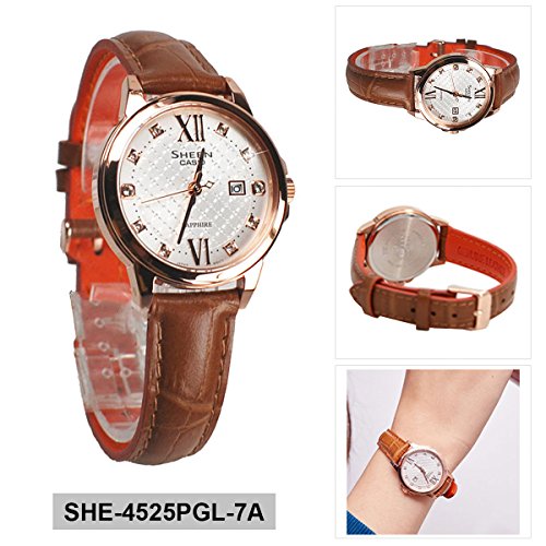 -. Binding : Watch -. Brand : Casio -. Department : Ladies -. EAN : 4549526140617 -. Feature : Casio SHE-4525PGL-7A Dial: 26 mm Case: From Casio Website: 31 (H) x 7 (W) x 14 mm (thickness) / Include: Casio Manual + Casio Box Amazon.com Warranty / Warranty: 2-Year Amazon.com Warranty provided by Amazon, no manufacturer warranty. / Box and Packaging: Our watch box are original but it is for Asia region, it might be different in the picture shown or different with box for US and EU market / WatchesZon : Delivery Time USA/AU/JP by Express 5-10 working days -. Label : Casio -. Manufacturer : Casio -. MPN : SHE-4525PGL-7A -. PartNumber : SHE-4525PGL-7A -. ProductGroup : Watch -. ProductTypeName : WATCH -. Publisher : Casio -. Studio : Casio -. Title : Casio Ladies Watch Sheen Analog Casual Quartz SHE-4525PGL-7A