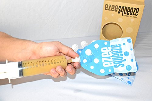 -. Binding : Baby Product -. Brand : Ezee Squeeze -. Color : blue white -. EAN : 0787688819369 -. Feature : Ezee fill options: • No Mess - Compact travel filler. • No need to fill through bottom with spoon or funnel • Portion control - Filler measures exact amount. / Ezee Uses - Fill with: • Baby food • Smoothies • Shakes • Sauces • Food for travel • Camping meals • and even adult beverages. / Ezee to Clean: • Dishwasher safe • Opening double zipper bottom helps with easy cleaning. • Rounded corner design prevents food from getting stuck in pouch. / Ezee on your Wallet: • Save money by making your own food to fill the pouches - not spending it on expensive disposable pouches • You will begin saving money within 2-3 uses. (Avg. P.R.Ice of Disposable Pouches : $1-$3 each) / Ezee on the Environment: • Reusable/durable • BPA free, Phthalate Free, PVC Free food grade plastic, non-toxic -. Label : Making It Ezee -. Manufacturer : Making It Ezee -. Model : EZ-1001 -. MPN : ezee0001 -. PartNumber : ezee0001 -. ProductGroup : Baby Product -. ProductTypeName : BABY_PRODUCT -. Publisher : Making It Ezee -. Size : 5oz -. Studio : Making It Ezee -. Title : Reusable Food Pouch 5 oz - 8 Count with Filler BPA Free by Ezee Squeeze -. UPC : 787688819369
