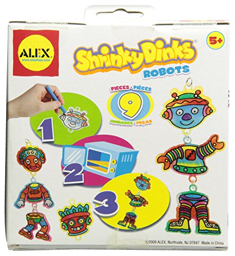 Shrinky Dinks Minis Robots is a logical way to spend a day indoors! Color, bake and shrink 3 androids to name and play with. Connect their pieces with jump rings and make up exciting adventures for them. Shrinky Dinks sheets are made of a special thin, flexible plastic which, when heated in an oven, shrink and harden without altering their color or shape. We precut all the fun shapes in every one of our kits to make them easy to work with! Includes 9 preprinted and precut Shrinky Dinks, 8 colored pencils, 10 jump rings and easy instructions. Recommended for children 5 years of age and older.Feature