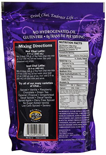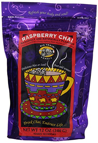 -. Binding : Grocery -. Brand : Big Train -. EAN : 0642628034038 -. Feature : Pack of three, 12-Ounce (Total of 36 ounces) / Creamy blend of raspberry, honey, black tea, and exotic spices with No Sugar added / Pre-mixed powder that makes a 10 servings of Chai Latte (per pouch) and requires no refrigeration / Simple to prepare - add a scoop of chai latte mix to hot or cold water, stir and enjoy / Big Train is based in Foothill Ranch California and distributes it's beverage mixes to coffee houses and retail outlets throughout the world -. Label : Big Train -. Manufacturer : Big Train -. Model : BT.540400 -. NumberOfItems : 3 -. PackageQuantity : 3 -. ProductGroup : Grocery -. ProductTypeName : GROCERY -. Publisher : Big Train -. Size : 12 Ounces -. Studio : Big Train -. Title : Big Train Raspberry Chai, 12-Ounce Bags (Pack of 3) -. UPC : 642628034038