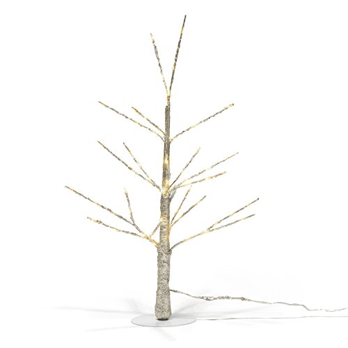 ✓ UNIQUE DETAILS- The tree is covered in champagne-colored glitter with a white metal round base. Branches are fully bendable and wrapped in silver wire LED Fairy Lights.