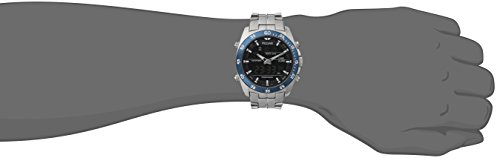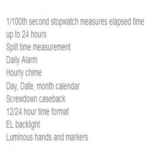 46.0mm diameter 1/100th second stopwatch measures elapsed time up to 24 hours Split time measurement Daily alarm Hourly chime Day, Date, month calendar Luminous hands and markers 12/24 hour time format Screwdown caseback EL backlight Water-resistant to 100 meters (330 feet) Silver-tone stainless steel Push button release clasp 3 year warranty on manufactory defects First year world wide warranty, 2nd and 3rd year only for USAFeature
