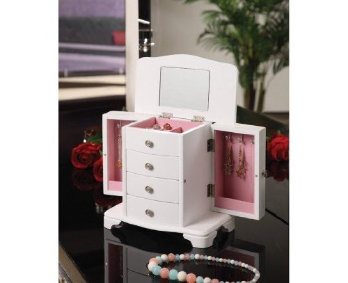 Nathan Direct Snow 4 Drawer Jewelry Box with 2 Side Compartments and a Lift-Top Compartment with Mirror and Ring Holders, White