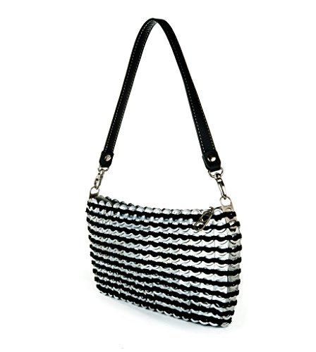 - Black and silver striped purse handmade in Brazil from recycled aluminum