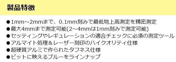 セッティングやレギュレーションの適合チェックに必須の測定ツールです。1mm~2mmまで、0.1mm刻みで最低地上高測定を精密測定し、最大4mmまで測定可能。