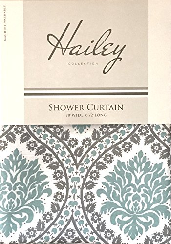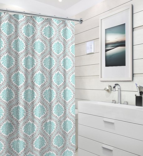 Aqua Grey White Fabric Shower Curtain: Canvas with Decorative Floral Damask Design, 70" x 72" inches