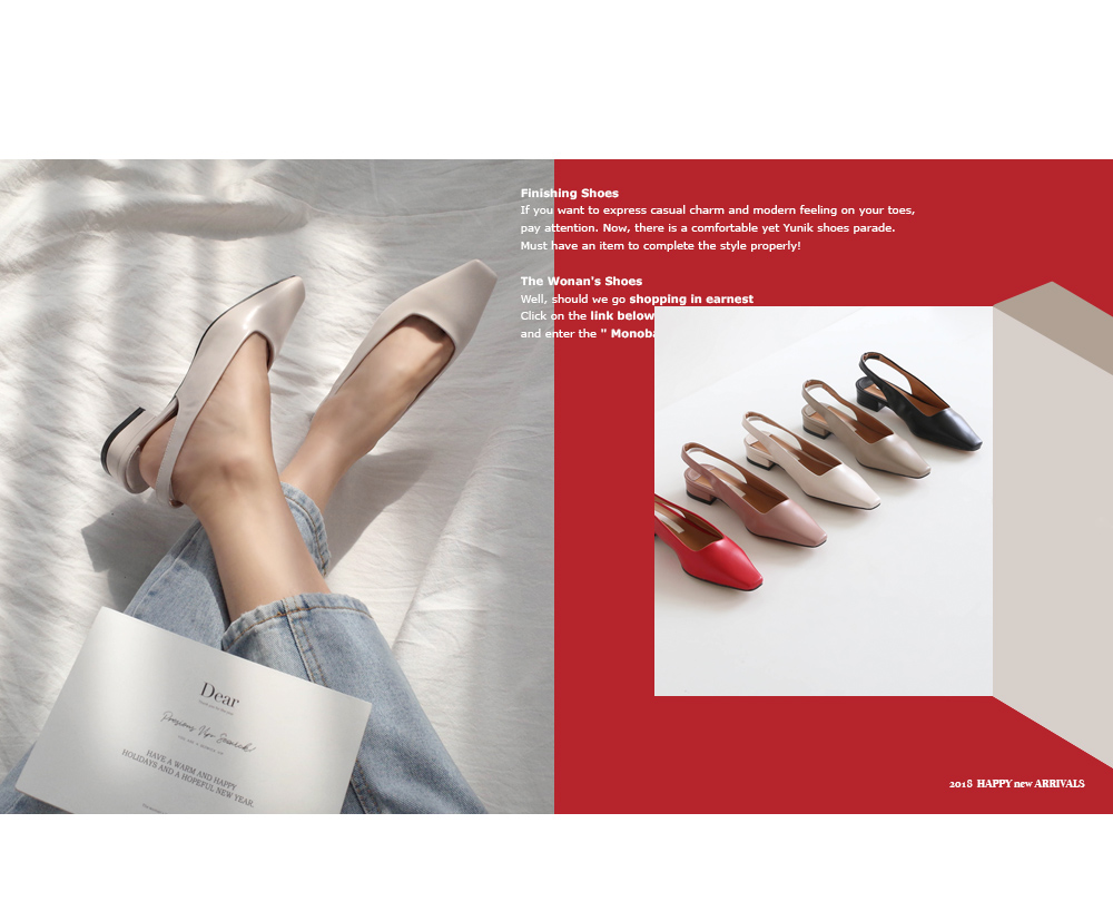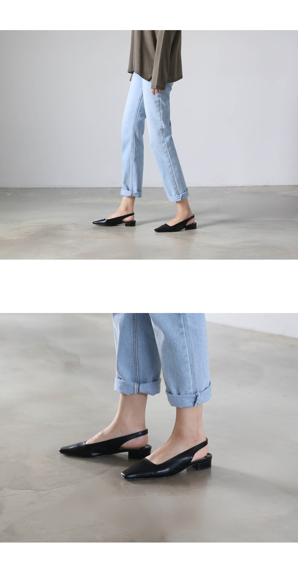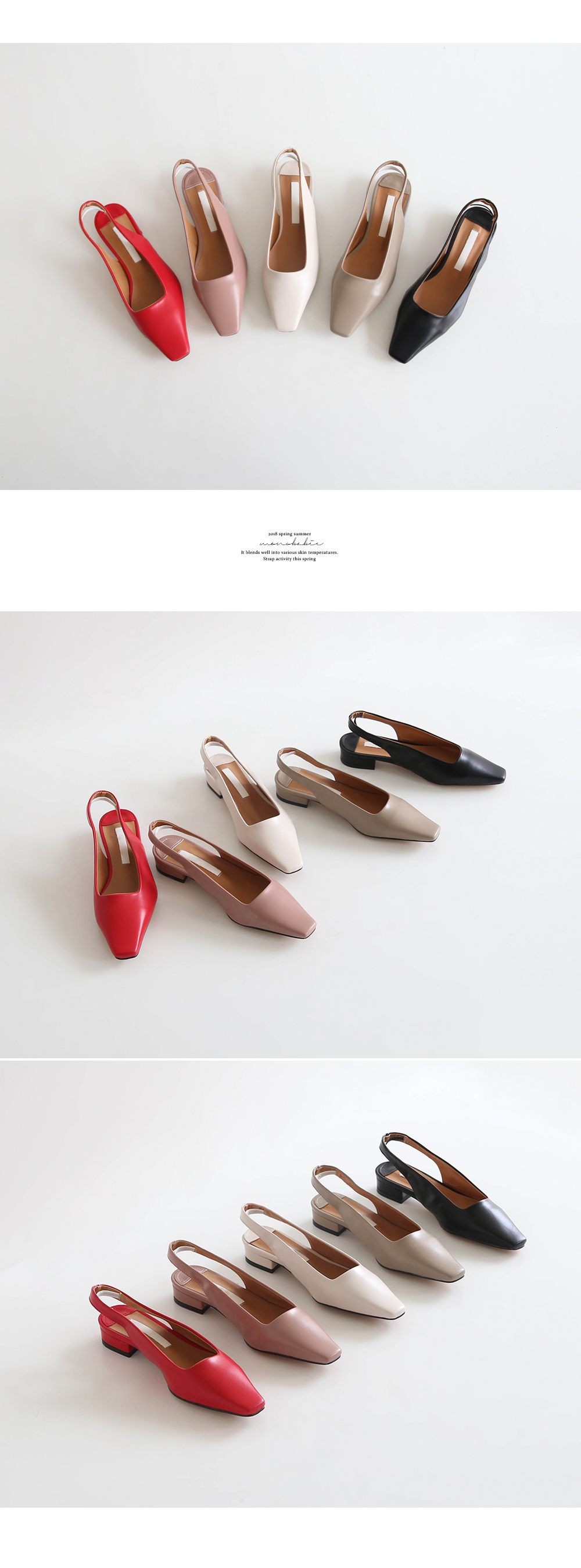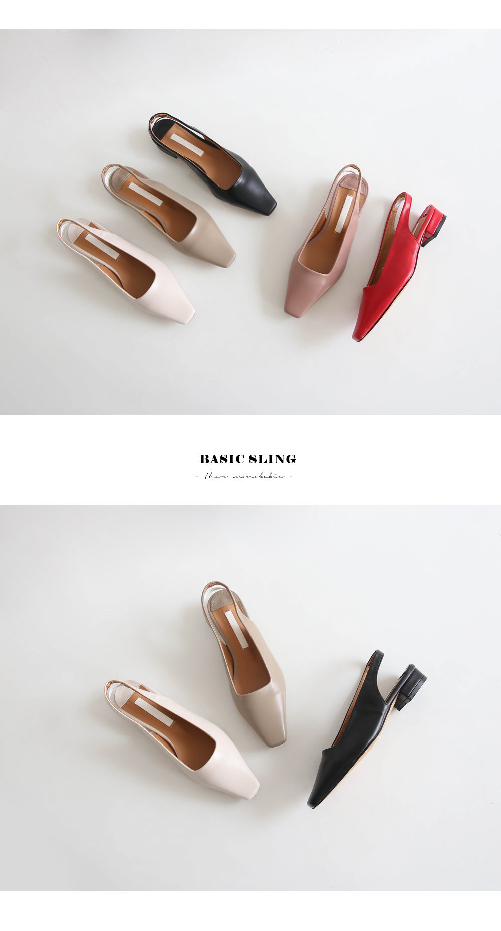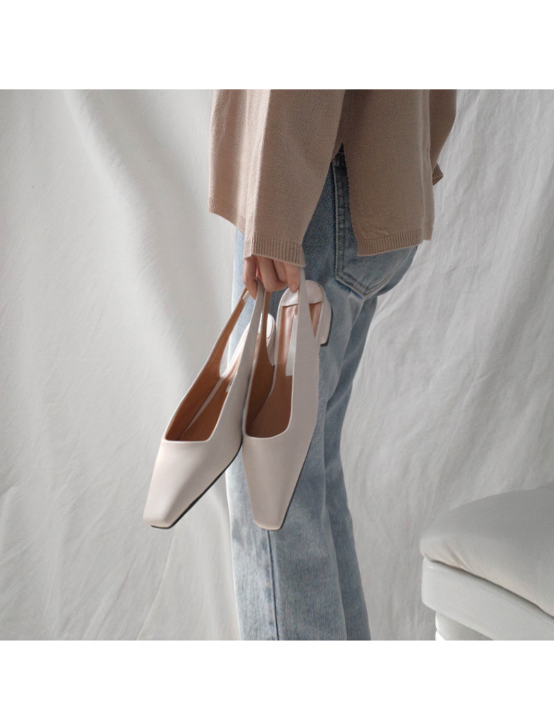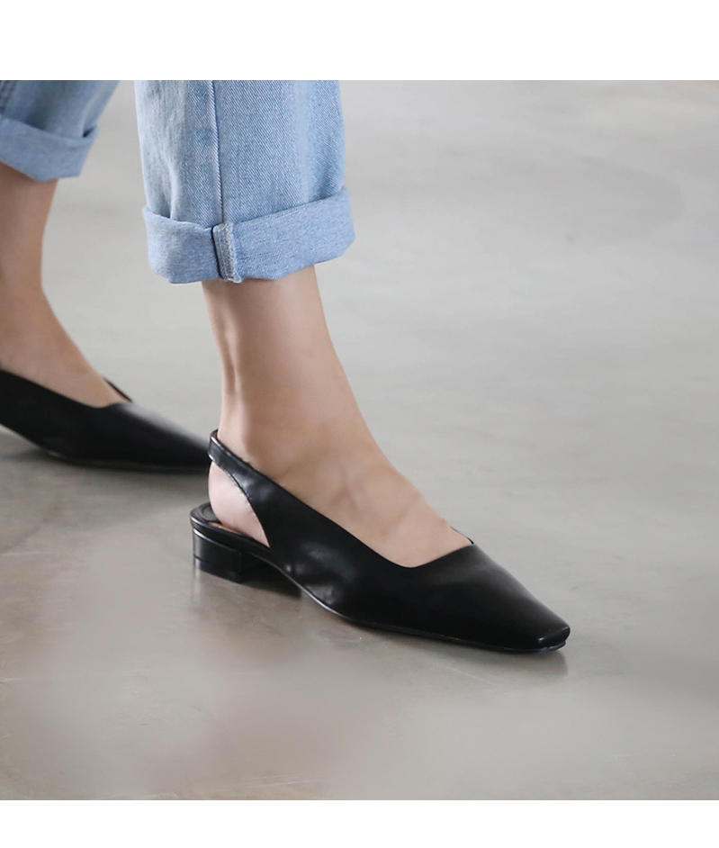 전체적인 큐트한 스퀘어진 쉐입이 돋보이는 데일리 플랫 슬링백 펌프스입니다.