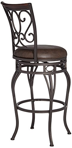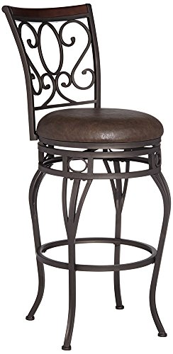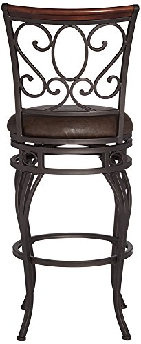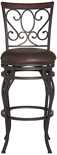 -. Feature : Swivel bar stool. / Top of seat back rest is solid poplar wood. / Metal openwork frame with subtle glitter bronze finish. / Brown faux leather upholstery. / Seat height is 30".