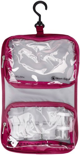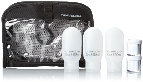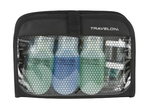 -. Binding : Apparel -. Brand : Travelon -. ClothingSize : One Size -. Department : unisex-adult -. Feature : 3-1-1 carry-on compliant / Combines a 1 quart bag with 2nd compartment for non-liquids / Hangs with a 360 degree swivel hook / Includes three 2 oz. reusable bottles, two 0.50 oz. jars and one 1.2oz bottle with atomizer -. Label : Travelon -. Manufacturer : Travelon -. NumberOfItems : 1 -. PackageQuantity : 1 -. ProductGroup : Apparel -. ProductTypeName : LAGE -. Publisher : Travelon -. Size : One Size -. Studio : Travelon -. Title : Travelon Wet Dry 1 Quart Bag with Plastic Bottles