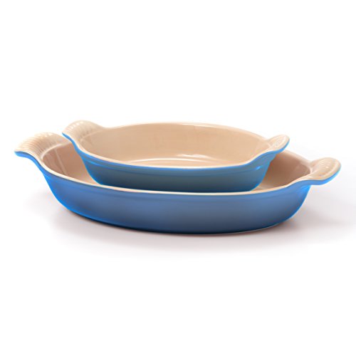 Studio : Le Creuset Publisher : Le Creuset Product Description Treat yourself to something delicious with this two piece set of Le Creuset au gratin dishes. These incredibly versatile cast stoneware pieces are perfect for all of your needs, from baking to serving and even storing. Each cookware piece is fired at 2156 degrees Fahrenheit, making them virtually nonporous so they don't absorb flavors, odors, or moisture. The enameled surface also makes them incredibly resistant to scratches, chipping, and staining. The Heritage style flared handles allow for safe maneuvering directly from oven to table. Perfect for individual servings, these unique little dishes offer huge possibilities. Serve up some snacks, appetizers, or your very own creme brulee, and enjoy the easy clean-up when you're through. Suitable for use in the oven up to 500 degrees Fahrenheit, these dishes can be broiled or baked. Backed by a five year manufacturer's warranty, they are also dishwasher safe for easy cleanup. 1.7 quart au gratin -- 8" L x 14" W x 2-1/2" H; 24 ounce au gratin -- 8" L x 5-3/4" W x 1-1/4" H 0