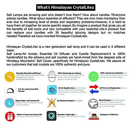 GREAT COMPANY TO YOUR ESSENTIAL OILS:Compatible with all kind of essential and aroma oils.Himalayan CrystalLitez are natural essential oil diffusers as well.Just a few drops of your favorite essential oils on top of the salt rocks will complete your whole aromatherapy session.Are you bored with your medical looking diffuser? Or you want to discover a new way to use your essential oils ? Then Himalayan CrystalLitez is the perfect brand new way to enjoy your daily essential oils.