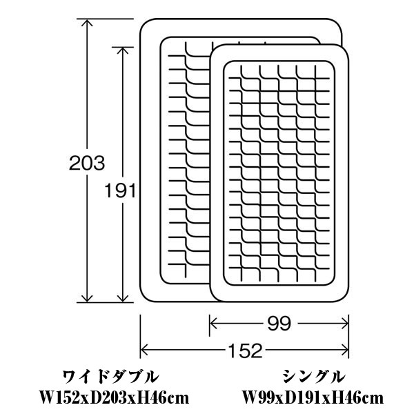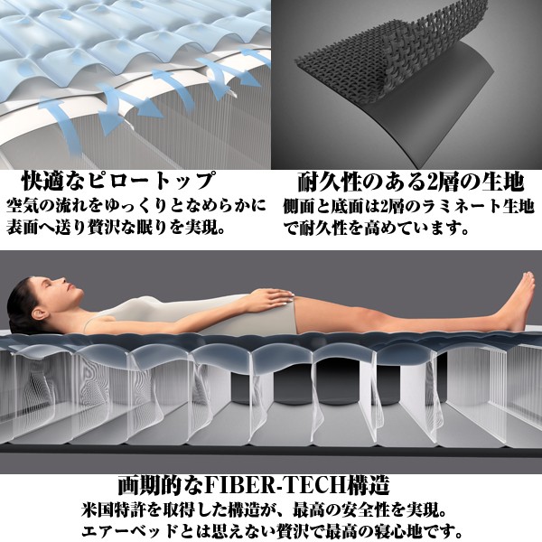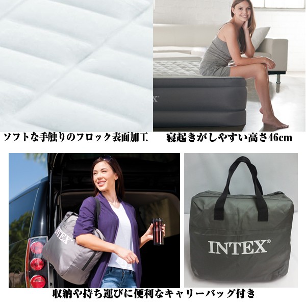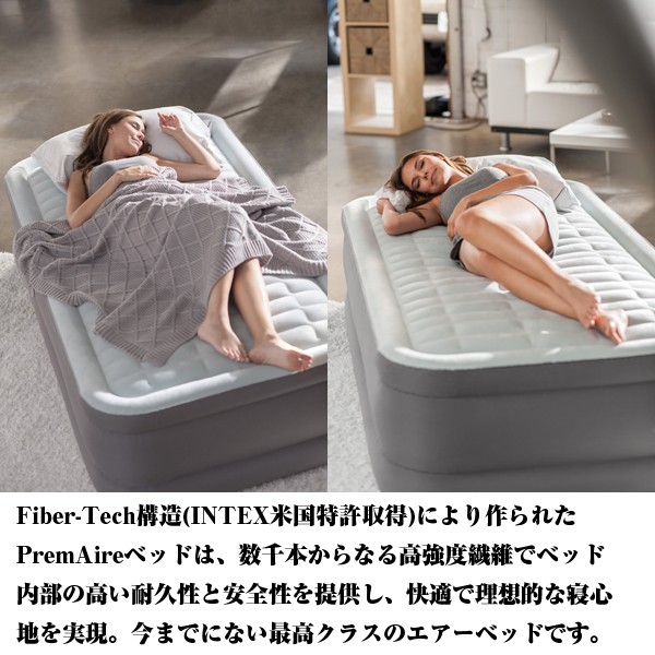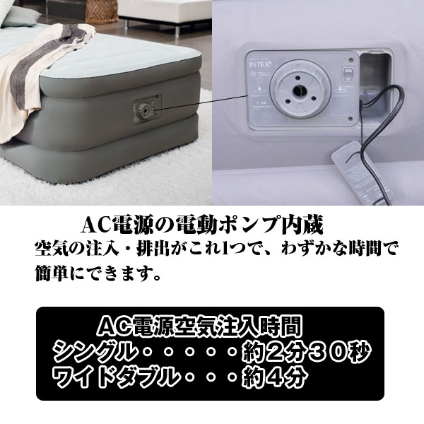INTEXエアーベッドからプレミアムタイプが誕生!極上すぎて、これがエアー!?寝てみれば分かります!! 通常27864円の処、12%OFF特別価格24624円にて限定販売!たった2~4分で自動空気出し入れ最速完成! あの、大人気エアーベッド「INTEX社製エアーベッド」がさらに進化!!2016年新商品モデルが誕生!!これまでのタイプの2層構造から3層構造にし、エアーポケットを作り、より寝心地の良さを実現しました!さらに、ベッドの高さをこれまでの33cmから46cmにし、側面、底面も2層にすることにより耐久性もアップしました。このエアーベッドの特徴は、予め、電動ポンプが内蔵されているので、ベッドをふくらせるのも、しぼませるのもスイッチ1つ!特許取得のファイバーテック構造採用で、ムダ揺れしない安定感を実現!心地よく眠りにつける分厚い高さ!コンパクトに持ち運べる収納袋付き。■サイズ:152×203×46cm