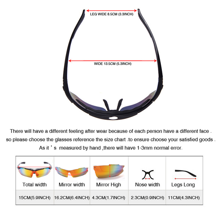 Very exellent quality sunglasses for cycling outdoor sports. 100% UV Protection??? Brand new 5 exchangeable Lens fit different weather situation. Flexibility?? Durability?? Light weight. Casual wear outdoor sports glasses.