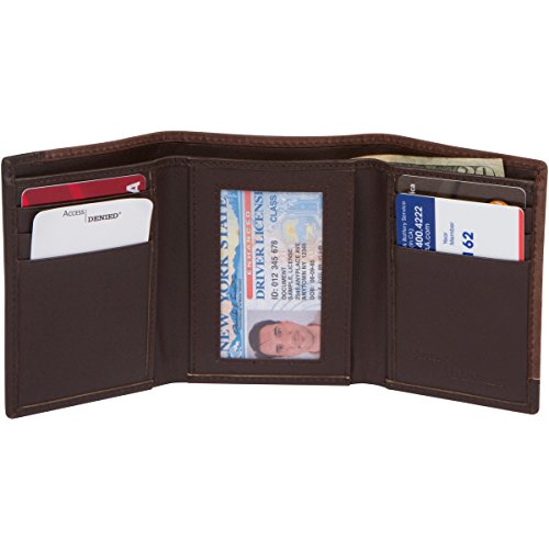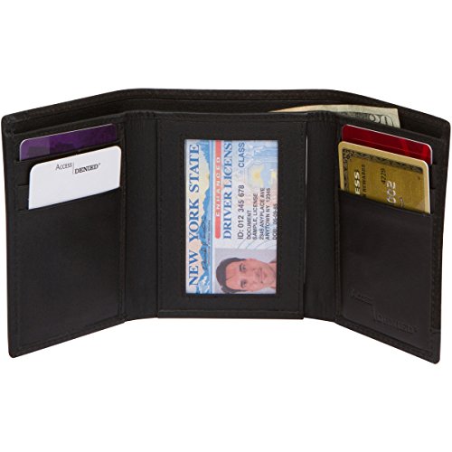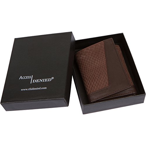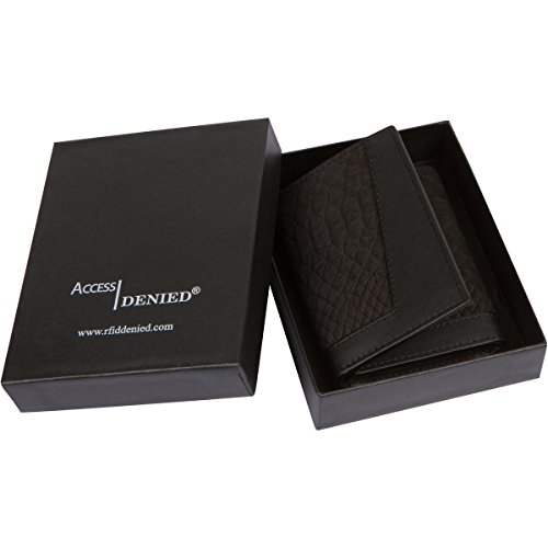 -. Binding : Apparel -. Brand : Access Denied -. Department : mens -. Feature : Access Denied Men's Slim RFID Trifold Wallet in Genuine Leather has RFID blocking protection in and around all pockets and folds with our proP.R.Ietary military grade RFID LockTM blocking technology, Independent lab tested and certified for RFID protection / Each quality hand crafted trifold wallet arrives in a gift box / Classic Trifold design with dual tone suede and top grain smooth leather features a handsome Anaconda embossed texture to not only ensure organization and durability, but also appeal / Dimensions: 3.25'' x 4.25" x .75" / Wallets' interior multi-function pockets include 6 turned edge credit card pockets, 1 transparent ID window, 2 currency pockets and 2 slip pockets all hand-finished -. PackageQuantity : 1 -. ProductGroup : Apparel -. ProductTypeName : ACCESSORY -. Size : One Size -. Title : Access Denied Men's RFID Wallet Genuine Leather Slim Trifold