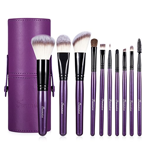 - Purple wooden handle and aluminum ferrule, not easy to break. Ideal for liquid, powder and cream Cosmetics makeup application. The brush set is including powder brush, foundation brush, contour brush, eye shadow brush, angled eye shadow brush, eyebrow brush, lip brush, eyeliner brush, Sponge shadow brush and eyelash brush.