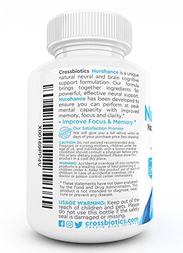 -. Feature : NEXT LEVEL BRAIN SUPPLEMENT - Nurohance has been formulated to include the perfect blend of natural ingredients which have been used for centuries to increase circulation to the brain to support mental focus, clarity and memory. Be in the zone and boost your brain! / ENHANCE MENTAL FOCUS, MEMORY & CLARITY - Nurohance is a natural Nootropic, supporting mental performance, memory and concentration. The Crossbiotics Nature plus Science approach blends herbal ingredients with the latest vitamin and mineral extracts including Bacopa, Zinc and Magnesium / NATURE PLUS SCIENCE - Our unique approach means Nurohance contains NO gluten, NO animal products, NO GMOs. Just world class ingredients and products / CONVENIENT ONCE DAILY DOSE - Just take Nurohance once a day and focus on performing at your peak mental capacity! Don't stress about taking supplements twice a day! / PURE, SAFE and EFFECTIVE - Crossbiotics Nurohance is Scientifically formulated and Made in the USA in a GMP certified facility. We're committed to ensuring that every product meets the highest quality control procedures for purity, potency, and safety. Buy now and try completely risk free! 100% SATISFACTION GUARANTEED!