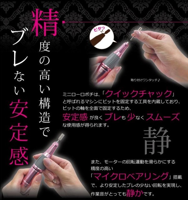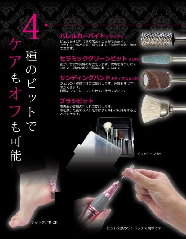 | セット内容 | ハンドピース(USBコード一体)、ACアダプター、ビット4種(バレルカーバイト ミディアム・セラミックグリーンビット 180・マンドレール・ブラシビット)、サンディングバンド ミディアム 120、アタッチメントケース、取扱説明書(保証書付き、保証期間:6ヶ月) |