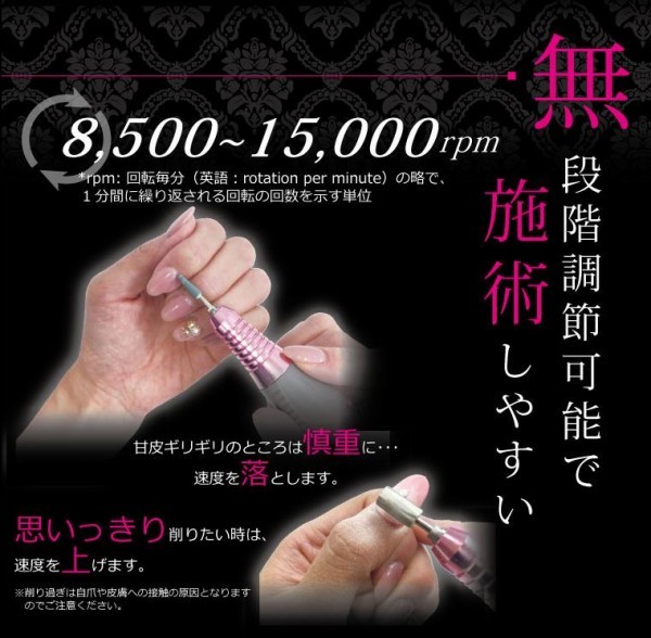 | 回転数8500-15000rpmで、ケアからオフまで可能。USB対応で持ち運びにも便利です。 |