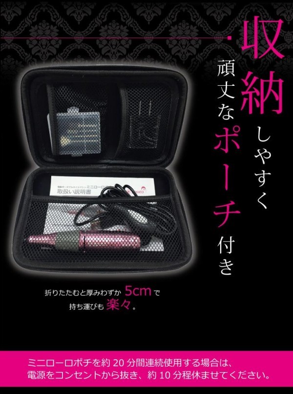 | サイズ | 収納(専用ケース)サイズ:W21×H14.5×D5cm、ハンドピース:最太部φ2.6×長さ13.5cm 個装サイズ:5×15×21cm |