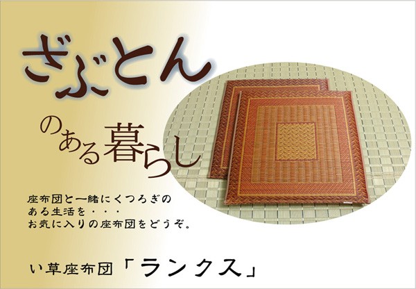 側地は紋織という技法で仕上げております。一般的な敷き物と同じようにイ草を織込み、しっかりとした生地に仕上げました。国産(九州産)のい草を使用しています。一本一本が太く、表皮が厚く繊維がキメ細かいので弾力性があり、耐久性に優れています。い草には空気の自然浄化作用、湿度の調節作用などがあります。また汚れにくく、使用するうちに黄金色に変化し味が出ます。い草に青森ヒバ加工を施しています(抗菌、防臭効果)。中材はポリエステルわたを凝縮させて仕上げた、固わたを使用しています。程良い弾力性があり、ヘタリにくいのが特徴です。
