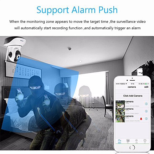 -. Feature : HD 1080P, support intelligent temperature and humidity sensors, real-time monitoring of indoors temperature and humidity, helping you build a healthy atmosphere for your family / PTZ rotation monitoring, horizontal 355 °, vertical 120 °, mobile phone remote control, PTZ up and down left and right rotation, where you want to see where you can see, you can know any monitoring angle with conveniently and quickly / Infrared night vision camera, camera automatic color to black and white at night , night vision distance up to 32 feet, clear picture, so you can accurately monitor at night / Mobile alarm and push functions, when surveillance area occurs moving target , surveillance video will automatically turn on recording function and automatically triggers an alarm, and your device will receive a warning message / Two-way voice intercom, you and your family, friends saying and listening through the camera, let you easily to experience the intelligent life