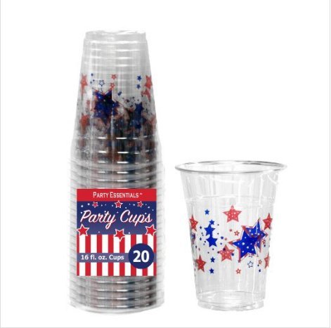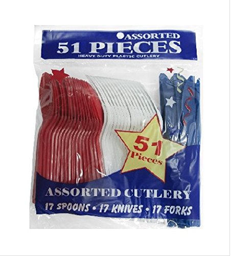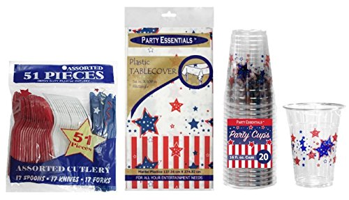 Patriotic Stars Collection by Party Essentials: 16oz Soft Plastic Cups 20 ct, Assorted Cutlery 17 Servings and 54in x 108in Rectangle Table Cover - Stars; Bundled by Oasis Mercantile (3)