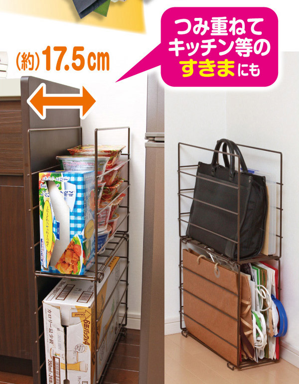 本品は、買い物袋の置き場所にピッタリなサイズの収納ラックで、積み重ねての使用もできます。