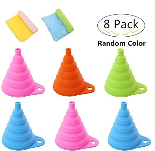 *2 Microfiber Cleaning Cloth for Bonus: Besides 6 pack Silicone Collapsible Funnels in the package, you will get 2 piece Microfiber Cleaning Cloth for Bonus. Great everyday cleaning cloths loosen food and grease for easy cleaning of dirty countertops, dishes, and pans. Use in your kitchen as an everyday, go-to for daily kitchen duties.