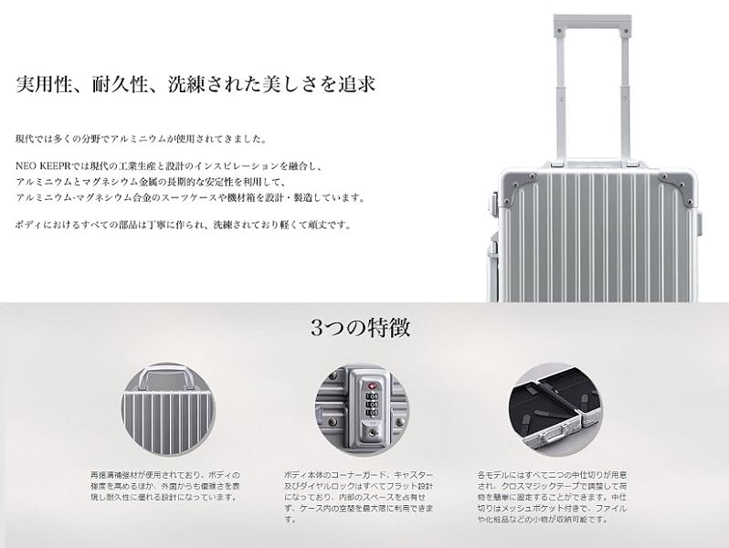 - 高剛性軽量アルミ製ボディとマグネシウム合金コーナーガードにより、高級感と高耐久性を実現しました。