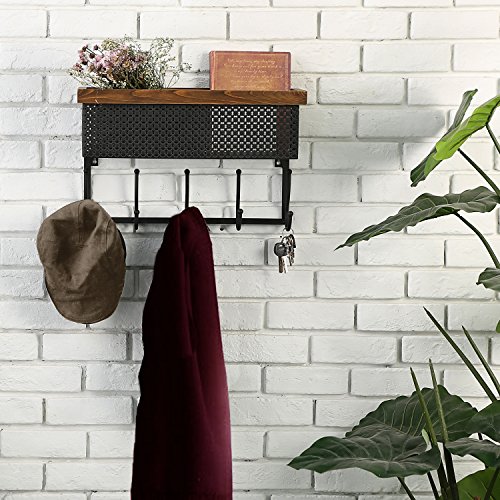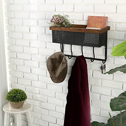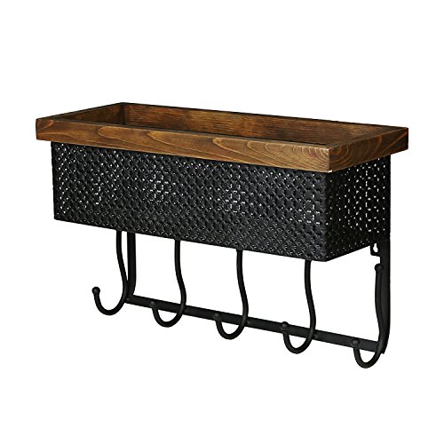 Metal Wall Mounted Wood Trim Coat Rack, Key Hooks with Storage Basket