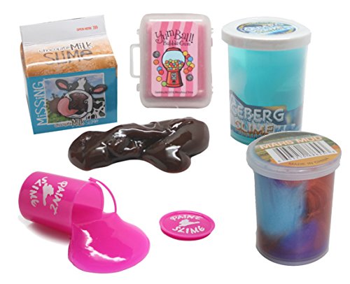 -. Feature : SET OF 5 SLIMES - This slime and putty sample lets you try out 5 different oozy, stretchable and mold-able slimes. Each putty offers something different for your kids who like messy sensory play. / Paint Can - Cute mini paint can slime. This is a very fun texture slime, it oozes and drapes well! Container: 2.75" tall x 2" wide jar. / Chocolate Milk Slime - Fun liquid slime packaged in a cute cardboard milk carton. Brown slime. Container: Each Slime Chocolate Milk Carton measures 2 3/4" x 2 3/4" x 3" with a plastic container inside measuring 2.5" x 2.5" x 2" / Mars Mud - This is more of a putty than a slime. It is thick and doesn't drip and isn't fluid like other slimes. Can be molded into shapes, rolled into a ball, or even cut with cookie cutters. Thick consistency, rips rather than stretches when pulled. Shiny metallic color mix. Container: 2.5" Tall x 1.25" wide. / Scented Mini Slime - Includes 1 scented putty that comes in an assortment of different colors and scents - (1 picked at random). Tiny container makes it a perfect putty to use discretely as a fidget at the office or school. Putty is stretchable, soft and moldable. Not wet or sticky. Fun to pull apart, shape or roll. Container: Mini Suitcase style plastic container measures 1.75" x 1.25" it is thin, 1/4" thick.ics, it stretches!