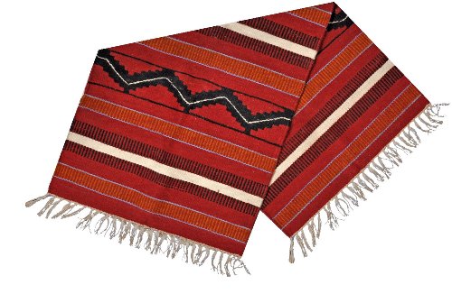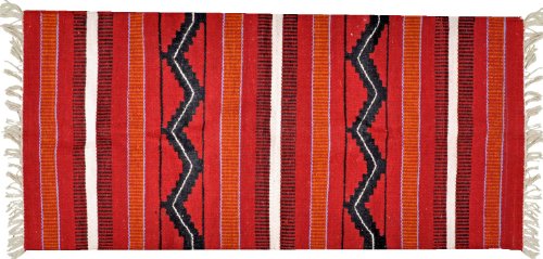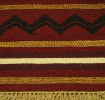 This Kilim rug is made in the village of Fowa, located on banks of the Nile River in Egypt. Handwoven on a loom and finished with hand knotted fringe. Reversible for twice the wear. May be rinsed with cold water and mild soap. Allow rug to dry flat before use