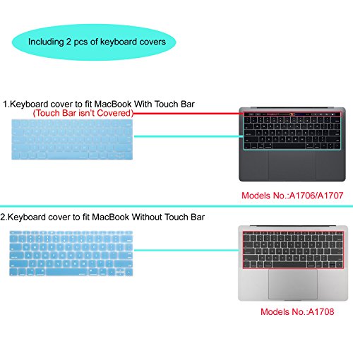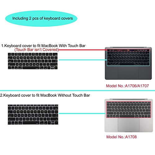 -. Feature : The case Only fits for Newest MacBook Pro Retina 13 Inch with Retina Display (A1706 with Touch Bar and A1708 with out Touch Bar, 2017 & 2016 Release), NO Cut Out design, transparency is different from color to color. / WARNING: This case can't MacBook Pro Retina 13 Inch No CD-Rom (A1502/A1425, Version 2015/2014/2013/2012), MacBook Air 13 Inch (A1369/A1466), Old MacBook Pro 13 Inch with CD-ROM (A1278), MacBook White 13 Inch (A1342). / Please kindly check the model number "A1xxx" on the back of the MacBook before your purchase. / Case Dimension: 12 x 8.5 x 0.6 inch, the Newest MacBook Pro 13 Inch with/without Touch Bar and Touch ID Dimension: 11.97 x 8.36 x 0.59 inch. / Including 2 matching color keyboard covers (one for Newest MacBook Pro Retina 13 Inch A1706 with touch bar and one for Newest MacBook Pro Retina 13 Inch A1708 without touch bar) & 1 screen protector & 1 small storage Bag to protect your MacBook keyboard & screen against spills and contamination. The small storage Bag is easy for you to storage MacBook mouse / MacBook charger / earphone. Mosiso 1 year warranty on case, keyboard cover and Mosiso lifetime warranty on rubber feet.