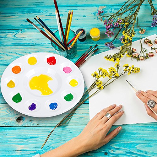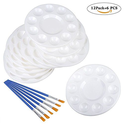 Plastic Circular Paint Tray Palettes with 10 Ink Wells Spaces for Acrylic/Watercolor Paint/ DIY Craft/Cupcakes/Oil – Set of 12 White Durable Washable Palette Plate and 6 Pieces Hair Paint Brush