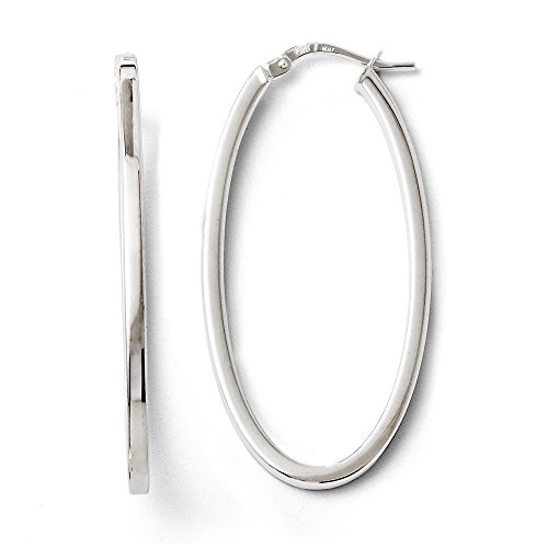 Simplicity offers versatility and timeless appeal. Designed from polished 10k white gold, these oval hoop earrings feature a square-shaped hollow tubing that measures approximately 2mm in thickness, 21mm (13/16 inch) in width by 41mm (1 5/8 inch) in length. Made in ItalyFeature