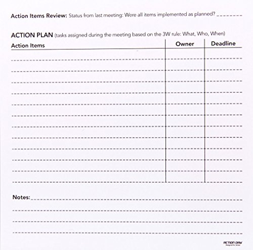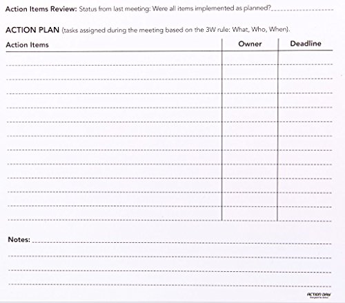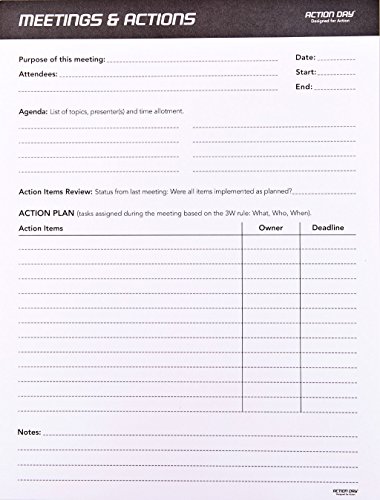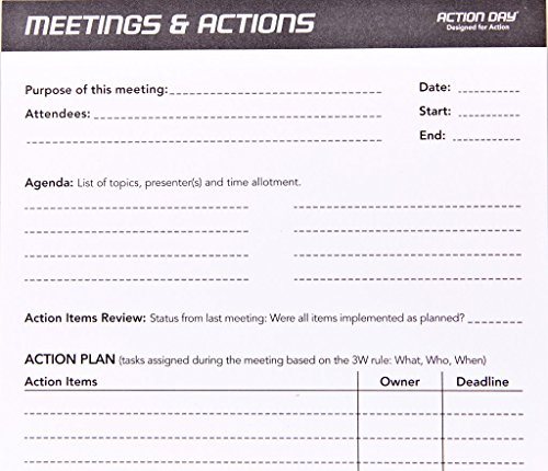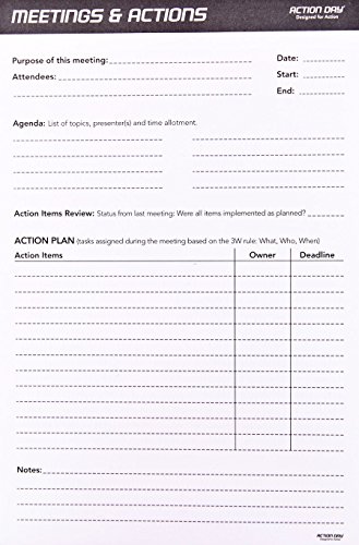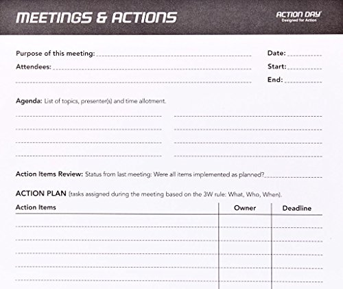 -. Binding : Office Product -. Brand : Action Day® -. Label : Action Day -. Manufacturer : Action Day -. PackageQuantity : 1 -. ProductGroup : Office Product -. ProductTypeName : OFFICE_PRODUCTS -. Publisher : Action Day -. Studio : Action Day -. Title : Action Day - Meetings & Actions Pad - Layout Designed to Run Effective Meetings that Get Things Done (Meeting Notepad (+) Meeting Notes)