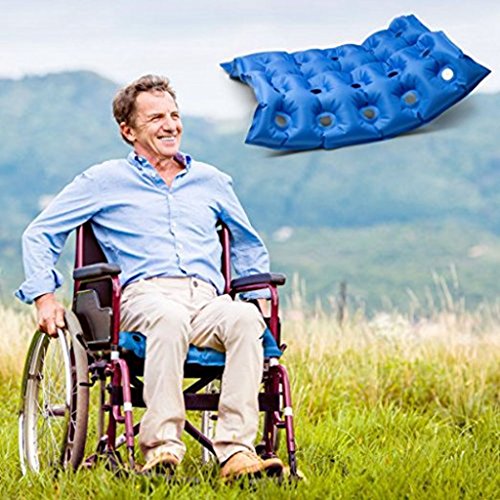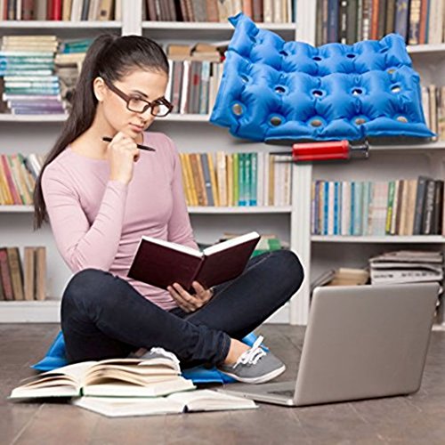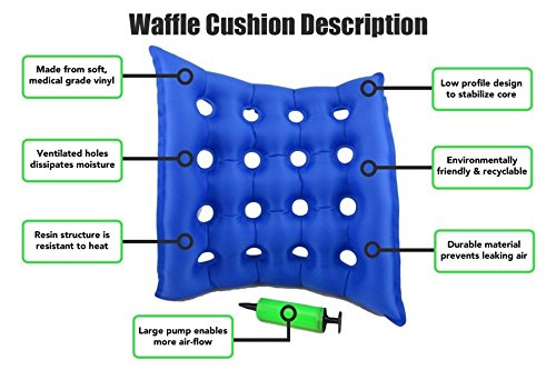 -. Feature : COMFORTABLE SEATING : Air Waffle Seat Cushion provides comfortable, stress free sitting with a gentle layer of air that helps to eliminate pressure points . The small ring shaped holes ensures body weight is evenly distributed without putting pressure on your lower back. / RELIEVES PRESSURE : Waffle Cushion comfortably relieves pressure from stressed out muscle due to injury or seating pressure. / EASY TO INFLATE OR DEFLATE : The uniquely designed Self Sealing Valve of the cushion and product pump helps to inflate the cushion much faster and holds the air longer than our competition. Deflation is as easy as Inflation. Just pinch the mouth of the valve and squeeze the cushion to let air out quickly. / Whether in wheelchairs, day chairs, or other hard surfaces, it's vital for our customers to have these surfaces covered, in order to aid in seating comfort and prevention and treatment of pressure ulcers and various other conditions. / EASY INFLATION: Fast and easy inflation by mouth or with the included air pump. Other cushions are difficult to inflate and can leave you feeling short of breath. With our included air pump, you will always be able to inflate your cushion quickly and easily.