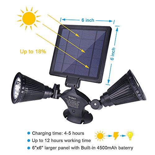 - POWERFUL SOLAR PANEL: this solar outdoor spotlights equipped with 5V/3W Solar Panel, charges during the day and works at night; 6"x 6" larger panel with built-in 4500mAh battery, up to 12 hours working time.